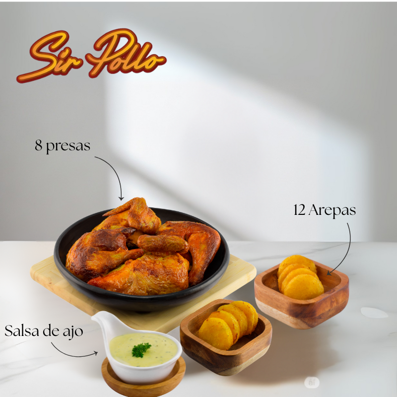 1 Delicioso pollo asado 100% natural, con todo el sabor de Sir Pollo. El pollo viene acompañado con arepas.