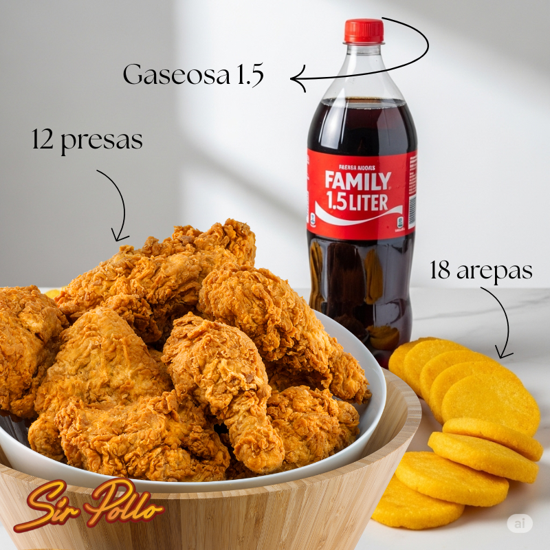 Perfecto para cualquier reunión, nuestro combo Sir Pollo Apanado Familiar incluye 12 presas de pollo apanado, 18 arepas y una gaseosa de 1.5 litros para que todos disfruten al máximo.